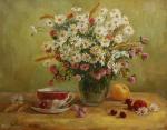 Ключевые слова: Натюрморт, ромашки, полевые цветы, летний букет, чайный натюрморт, лето.