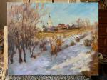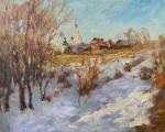 Лирический пейзаж передаёт атмосферу ранней весны в Подмосковье, когда тающий снег открывает землю и воздух наполняется мягким светом. Свободная манера письма и богатая фактура масляной живописи создают ощущение свежести, простора и пробуждения природы. Картина наполнена спокойствием и передаёт поэтичное настроение русской провинции.
