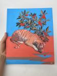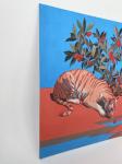 Оригинальная акриловая картина, изображающая отдыхающего тигра в символическом природном пространстве. Животное спокойно лежит у мелкого ручья, окружённое цветущими ветвями с яркими красными ягодами. Работа выполнена в стиле современного фольклорного и наивного искусства и вдохновлена поэтичной образностью живописи Анри Руссо.
