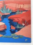 Оригинальная акриловая картина, изображающая отдыхающего белого леопарда, лежащего на плоском камне у извилистого ручья. Сцена разворачивается в символическом пейзаже со стилизованными деревьями, пустынными растениями и далёкими горами. Работа выполнена в стиле современного фольклорного и наивного искусства и вдохновлена поэтической образностью живописи Анри Руссо.