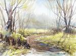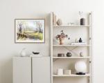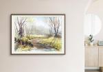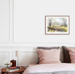 Пейзаж выполнен салатово-бежевой гамме с применением качественных материалов, на плотной акварельной бумаге 300г.