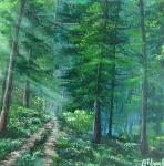 «Рассвет в лесу» — это момент тишины, когда солнце только начинает свой путь и мягкие лучи осторожно пробираются сквозь высокие деревья. Свет скользит по тропинке, отражается в спокойной воде и наполняет пространство ощущением свежести и лёгкости. Насыщенная зелень, прозрачный воздух и игра света создают эффект присутствия — словно вы стоите среди этого леса и слышите его утреннее дыхание. Пейзаж дарит чувство гармонии, спокойствия и внутреннего обновления