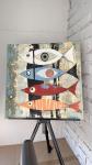 На этой картине изображены четыре стилизованные, абстрактные рыбы, расположенные горизонтально друг над другом, каждая со своим уникальным ярким цветом и выразительным глазом. Работа выполнена в современном стиле с богатой текстурой фона и использованием смелых, контрастных оттенков, придающих ей декоративный и примитивный вид.