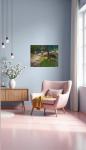 Фон картины заполнен густой зеленью деревьев и кустарников, создающих ощущение уединения и спокойствия. Свет, пробивающийся сквозь листву, мягко освещает дорожку, ведущую к мосту, и подчеркивает игру света и тени. Цветовая палитра картины насыщена зелеными, коричневыми и золотистыми оттенками, что придает ей теплую и гармоничную атмосферу.