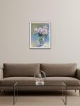 Нежные, белоснежные пионы. Белый цвет распустившихся бутонов не статичен – он играет оттенками ванильного, розоватого, бледно-лимонного. Картина дышит свежестью и легкостью