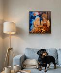 Эта оригинальная картина маслом изображает мистическую сцену, вдохновлённую славянским фольклором и традиционными образами русской культуры. В тихой лесной поляне у спокойной реки у небольшого костра сидят две героини - бледноволосая речная русалка и молодая русская девушка в традиционном красном платье и украшенном орнаментами кокошнике.
