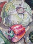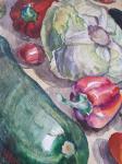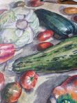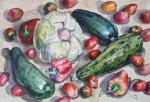 Ключевые слова: Акварель, натюрморт, овощи, капуста, цукини, кабачки, болгарский перец, помидоры, дамские пальчики, свежесть, урожай, кухня, столовая, интерьерная картина, реализм, дача, лето, яркие цвета, подарок хозяйке, современная акварель.