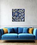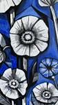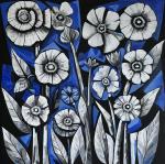 Эта картина передает восприятие природы художницы через контраст черных, белых и насыщенных синих оттенков. Цветовая гамма создает ощущение глубины и одновременно противопоставляет яркие живые цветы тьме или сложностям жизни.