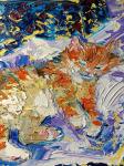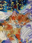 Котик, растянувшись в полном расслаблении, передаёт нежную усталость и спокойствие после долгого дня.Картина напоминает о важности находить время для себя