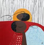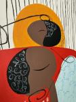• Композиция и фигуры: Картина изображает две стилизованные фигуры людей с темной кожей, расположенные друг над другом. Фигуры имеют простые черты лица с закрытыми глазами и стилизованными прическами, украшенными белыми завитками.