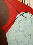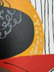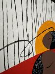 • Фон и детали: Задний план состоит из вертикальных черных линий на белом фоне. Над верхней фигурой расположено оранжевое солнце или полумесяц. Нижняя фигура находится на большом красном фоне и частично покрыта тканью с белыми точками и голубой тканью с круговым узором.