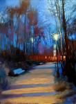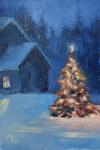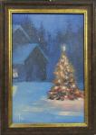 Маленький милый пейзаж с новогодним настроением, с нарядной новогодней ёлочкой на даче. Готовый подарок на Новый Год и Рождество, оформлено в багет.