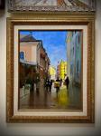 Картина передаёт дух живого московского переулка: пастельные здания, купола на заднем плане, блики солнца на мокром асфальте после дождя, элегантные прохожие с кофе и сумочками.