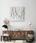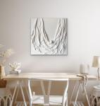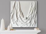В основе работы — драпированная ткань, загипсованная и многократно укреплённая слоями гипса и рельефных паст. Благодаря этому панно приобрело настоящую скульптурность и глубину (5 см), сохранив естественность драпировки. Живые мазки акрила поверх рельефа не сглаживают поверхность, а подчёркивают её энергичность и рукотворность. Цвет — тёплый, между белым и ivory — делает произведение особенно мягким и приятным для интерьера.