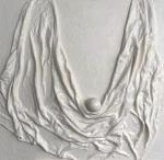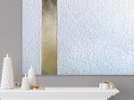 Это декоративное панно создано как современный акцент для интерьера. Белый рельефный фон, выполненный из текстурных паст, образует живую поверхность, а сбоку проходит золотая вертикальная полоса, покрытая поталью.