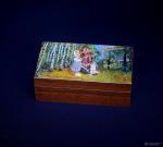 Шкатулка изготовлена из разных пород дерева в стиле лаковой миниатюры. Размер изображения 85 на 155 мм. высота шкатулки 55 мм.