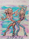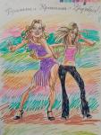 Двойной дружеский шарж. Сюжетом послужило предполагаемое соперничество поп-звёзд Бритни Спирс и Кристины Агилеры. Шарж нарисован в 2002 году. Тогда я считала, что можно найти "формулу" шаржа и пыталась это сделать.