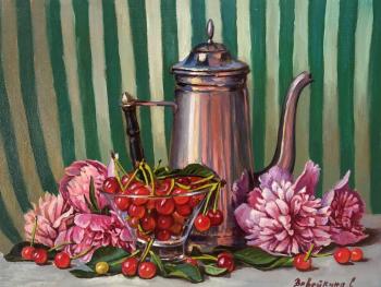 Вавейкина Светлана. Натюрморт в стиле модерн со старинным кофейником (Пионы И Черешня На Столе)