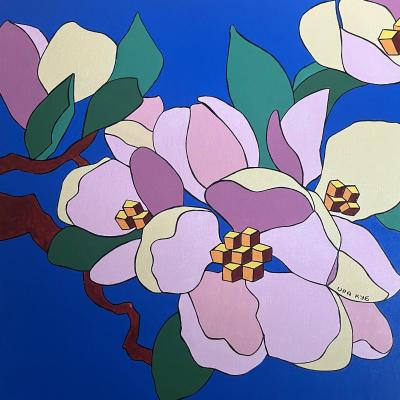 Комаровская Елена. Цветущая ветка яблони и розы в серебряной вазе